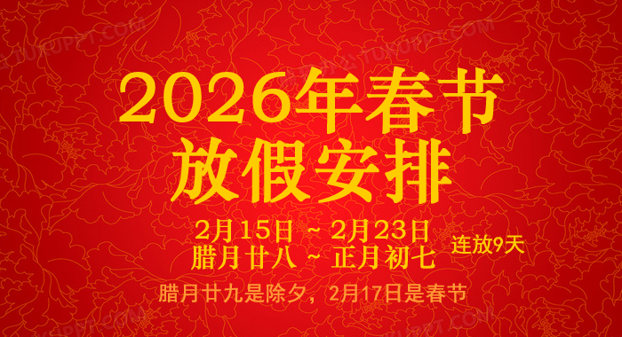 2026年春节连续放假9天,日期:2月15日 ~ 23日(腊月廿八 ~ 正月初七)。