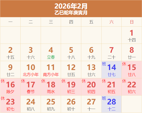 节后补班:2月28日(周六),连上5天班后,3月1日休一天,之后恢复正常。突然发现过完春节,已经是2026年3月了,大家要加油哦~